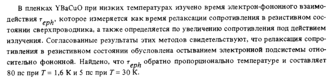 В пленках YBaCuO при низких температурах изучено время электрон-фононного взаимодействия τ ^, которое измеряется как время релаксации сопротивления в резистивном состоянии сверхпроводника, а также определяется по увеличению сопротивления под действием излучения. Согласованные результаты этих методов свидетельствуют, что релаксация сопротивления в резистивном состоянии обусловлена остыванием электронной подсистемы относительно фононной. Найдено, что τ ^ обратно пропорционально температуре и составляет 80 пс при Т1,6 К и 5 пс при Т= 30 К.