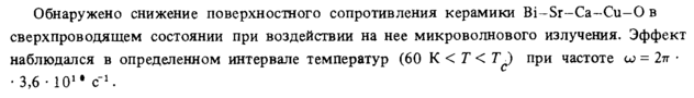 Обнаружено снижение поверхностного сопротивления керамики Bi-Sr-Ca~Cu-0 в сверхпроводящем состоянии при воздействии на нее микроволнового излучения. Эффект наблюдался в определенном интервале температур (60 К < Τ < 7V) при частоте ω = 2π · • 3,6 · 101* с"1.