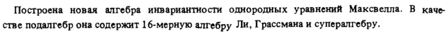 Построена новая алгебра инвариантности однородных уравнений Максвелла. В качестве подалгебр она содержит 16-мерную алгебру Ли, Грассмана и супералгебру,