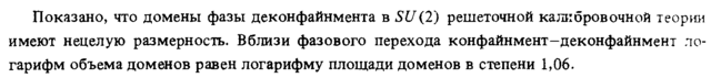 Показано, что домены фазы деконфайнмента в SU{2) решеточной калибровочной теории имеют нецелую размерность. Вблизи фазового перехода конфайнмент-деконфайнмент логарифм объема доменов равен логарифму площади доменов в степени 1,06.