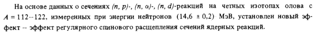 На основе данных о сечениях (п, р)-, (п, а)-, (п, ^-реакций на четных изотопах олова с Л = 112-122, измеренных при энергии нейтронов (14,6 ± 0,2) МэВ, установлен новый эффект эффект регулярного спинового расщепления сечений ядерных реакций.