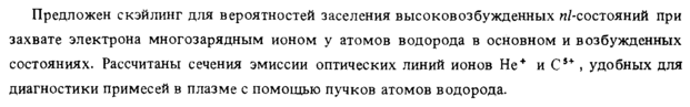 Предложен скэйлинг для вероятностей заселения высоковозбужденных «/-состояний при захвате электрона многозарядным ионом у атомов водорода в основном и возбужденных состояниях. Рассчитаны сечения эмиссии оптических линий ионов Не+ и С5+ , удобных для диагностики примесей в плазме с помощью пучков атомов водорода.