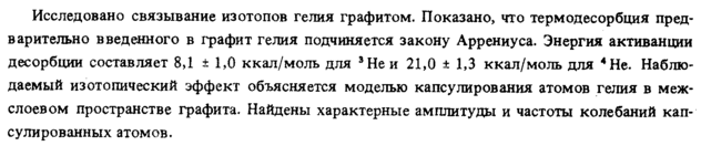 Исследовано связывание изотопов гелия графитом. Показано, что термодесорбция предварительно введенного в графит гелия подчиняется закону Аррениуса. Энергия активанции десорбции составляет 8,1 ± 1,0 ккал/моль для 3Неи 21,0 + 1,3 ккал/моль для 4 Не. Наблюдаемый изотопический эффект объясняется моделью капсулирования атомов гелия в межслоевом пространстве графита. Найдены характерные амплитуды и частоты колебаний кап-сулированных атомов.