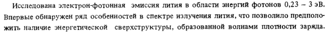 Исследована электрон-фотонная эмиссия лития в области энергий фотонов 0,23 ~ 3 эВ. Впервые обнаружен ряд особенностей в спектре излучения лития, что позволило предположить наличие энергетической сверхструктуры, образованной волнами плотности заряда,