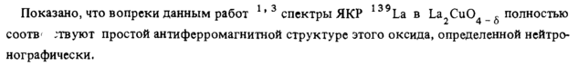 Показано, что вопреки данным работ 1' 3 спектры ЯКР 139La в La Cu04 _ δ полностью соотв' лзуют простой антиферромагнитной структуре этого оксида, определенной нейтро-нографически.