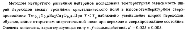 Методом неупругого рассеяния нейтррнов исследована температурная зависимость ширин переходов между уровнями кристаллического поля в высокотемпературном сверхпроводнике Tmo;iУо,9ВагСиз06 9-При Τ < ^с наблюдено уменьшение ширин переходов, обусловленное открытием энергетической щели при переходе в сверхпроводящее состояние. Оценена константа, характеризующая силу 1-/-взаимодействия, р' = 0,025 ± 0,005.