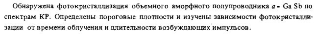 Обнаружена фотокристаллизация объемного аморфного полупроводника a Ga Sb по спектрам КР, Определены пороговые плотности и изучены зависимости фотокристаллизации от времени облучения и длительности возбуждающих импульсов,