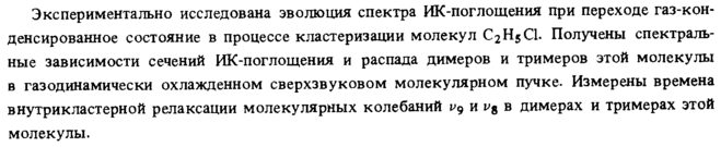 Экспериментально исследована эволюция спектра ИК-поглощения при переходе газ-кон-денсированное состояние в процессе кластеризации молекул C2H5CI. Получены спектральные зависимости сечений ИК-поглощения и распада димеров и тримеров этой молекулы в газодинамически охлажденном сверхзвуковом молекулярном пучке. Измерены времена внутрикластерной релаксации молекулярных колебаний и9 и vb в димерах и тримерах этой молекулы.