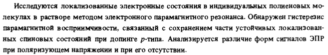 Исследуются локализованные электронные состояния в индивидуальных полиеновых молекулах в растворе методом электронного парамагнитного резонанса. Обнаружен гистерезис парамагнитной восприимчивости, связанный с сохранением части устойчивых локализованных спиновых состояний при допинге р-типа. Анализируется различие форм сигналов ЭПР при поляризующем напряжении и при его отсутствии.