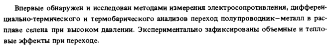 Впервые обнаружен и исследован методами измерения электросопротивления, дифференциально-термического и термобарического анализов переход полупроводник-металл в расплаве селена при высоком давлении. Экспериментально зафиксированы объемные и тепловые эффекты при переходе.