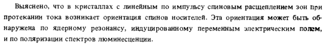 Выяснено, что в кристаллах с линейным по импульсу спиновым расщеплением зон при протекании тока возникает ориентация спинов носителей. Эта ориентация может быть обнаружена по ядерному резонансу, индуцированному переменным электрическим полгм, и по поляризации спектров люминесценции.