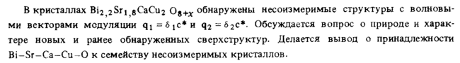 В кристаллах l^^Sr^gCaCt^ 0^+χ обнаружены несоизмеримые структуры с волновыми векторами модуляции qi=6jC*H Я2~^2С*Обсуждается вопрос о природе и характере новых и ранее обнаруженных сверхструктур. Делается вывод о принадлежности Bi-Sr-Ca-Cu-Ο к семейству несоизмеримых кристаллов.