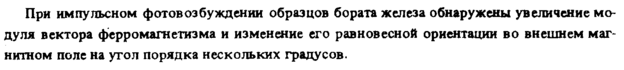 При импульсном фотовозбуждении образцов бората железа обнаружены увеличение модуля вектора ферромагнетизма и изменение его равновесной ориентации во внешнем магнитном поле на угол порядка нескольких градусов.