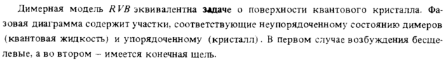 Димерная модель R VB эквивалентна задаче о поверхности квантового кристалла. Фазовая диаграмма содержит участки, соответствующие неупорядоченному состоянию димеров (квантовая жидкость) и упорядоченному (кристалл). В первом случае возбуждения бесщелевые, а во втором имеется конечная щель.