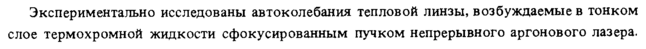 Экспериментально исследованы автоколебания тепловой линзы, возбуждаемые в тонком слое термохромной жидкости сфокусированным пучком непрерывного аргонового лазера.