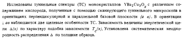 Исследованы туннельные спектры (ТС) монокристаллов УВазСизО^ с различным содержанием кислорода, полученные с помощью сканирующего туннельного микроскопа в ориентациях перпендикулярной и параллельной базовой плоскости (а в). В ориентации 1 ав наблюдаются две щелевые особенности ТС. Зависимость величины энергетической щели А(х) по характеру подобна зависимости Τ (χ). Установлена систематическая неоднородность распределения Δ по толщине образца.