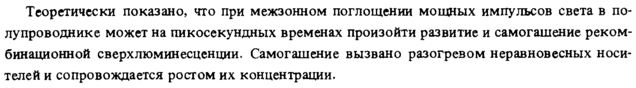 Теоретически показано, что при межзонном поглощении мощных импульсов света в полупроводнике может на пикосекундных временах произойти развитие и самогашение реком-бинационной сверхлюминесценции. Самогашение вызвано разогревом неравновесных носителей и сопровождается ростом их концентрации.