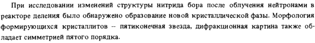 При исследовании изменений структуры нитрида бора после облучения нейтронами в реакторе деления было обнаружено образование новой кристаллической фазы. Морфология формирующихся кристаллитов пятиконечная звезда, дифракционная картина также обладает симметрией пятого порядка.