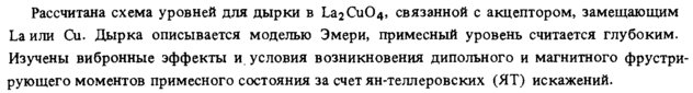Рассчитана схема уровней для дырки в La2Cu04, связанной с акцептором, замещающим La или Си. Дырка описывается моделью Эмери, примесный уровень считается глубоким. Изучены вибронные эффекты и условия возникновения дипольного и магнитного фрустри-рующего моментов примесного состояния за счет ян-теллеровских (ЯТ) искажений.