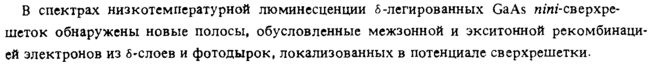В спектрах низкотемпературной люминесценции δ-легированных GaAs шш-сверхрешеток обнаружены новые полосы, обусловленные межзонной и экситонной рекомбинацией электронов из δ-слоев и фотодырок, локализованных в потенциале сверхрешетки.