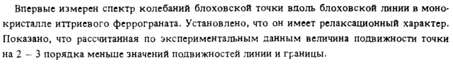 Впервые измерен спектр колебаний блоховской точки вдоль блоховской линии в монокристалле иттриевого феррограната. Установлено, что он имеет релаксационный характер. Показано, что рассчитанная по экспериментальным данным величина подвижности точки на 2 3 порядка меньше значений подвижностей линии и границы,