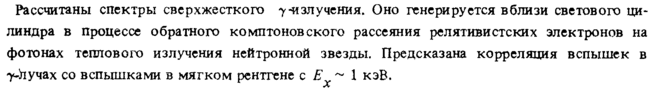 Рассчитаны спектры сверхжесткого 7-излучения. Оно генерируется вблизи светового цилиндра в процессе обратного комптоновского рассеяния релятивистских электронов на фотонах теплового излучения нейтронной звезды. Предсказана корреляция вспышек в Ύ-лучах со вспышками в мягком рентгене с Ε ~ 1 кэВ.