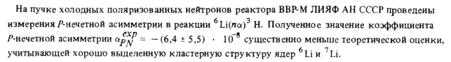 На пучке холодных поляризованных нейтронов реактора ВВР-М ЛИЯФ АН СССР проведены измерения ^-нечетной асимметрии в реакции 1л(ла) Н. Полученное значение коэффициента Р-нечетной асимметрии otp^г = (6,4 ±5,5) · 10 существенно меньше теоретической оценки, учитывающей хорошо выделенную кластерную структуру ядер 6Li и 7 Li.