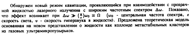 Обнаружен новый режим кавитации, проявляющийся при взаимодействии с прозрачной жидкостью лазерного излучения с широким частотным спектром Δω. Показано, что эффект возникает при Δω > (J)ui0 ξ Ω (ω0 центральная частота спектра, с скорость света, υ скорость гиперзвука в жидкости). Предложена теоретическая модель основанная на новом представлении о жидкости как коллоиде метастабильных кластеров из газовых ультрамикропузырьков.
