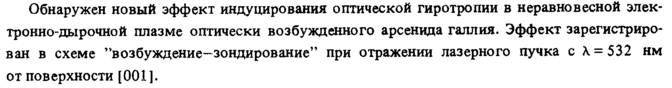 Обнаружен новый эффект индуцирования оптической гиротропии в неравновесной электронно-дырочной плазме оптически возбужденного арсенида галлия. Эффект зарегистрирован в схеме "возбуждение-зондирование" при отражении лазерного пучка с λ = 532 нм от поверхности [001].