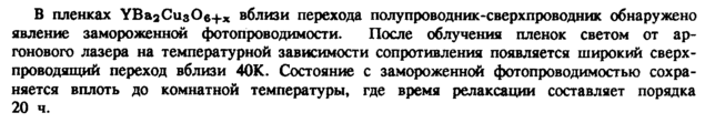 В пленках УВазСизОв+х вблизи перехода полупроводник-сверхпроводник обнаружено явление замороженной фотопроводимости. После облучения пленок светом от аргонового лазера на температурной зависимости сопротивления появляется широкий сверхпроводящий переход вблизи 40К. Состояние с замороженной фотопроводимостью сохраняется вплоть до комнатной температуры, где время релаксации составляет порядка 20 ч.