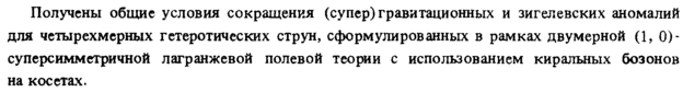 Получены общие условия сокращения (супер) гравитационных и зигелевских аномалий для четырехмерных гетеротических струн, сформулированных в рамках двумерной (1, 0)-суперсимметричной лагранжевой полевой теории с использованием киральных бозонов на косетах.