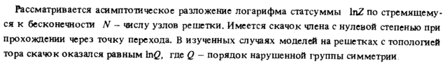 Рассматривается асимптотическое разложение логарифма статсуммы InZ по стремящемуся к бесконечности Ν ~ числу узлов решетки. Имеется скачок члена с нулевой степенью при прохождении через точку перехода. В изученных случаях моделей на решетках с топологией тора скачок оказался равным 1п£, где Q порядок нарушенной группы симметрии