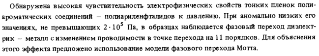 Обнаружена высокая чувствительность электрофизических свойств тонких пленок полиароматических соединений полиариленфталидов к давлению. При аномально низких его значениях, не превышающих 2-Ю5 Па, в образцах наблюдается фазовый переход диэлектрик металл с изменением проводимости в точке перехода на 11 порядков. Идя объяснения этого эффекта предложено использование модели фазового перехода Мотта.