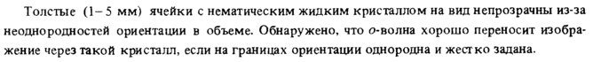 Толстые (1-5 мм) ячейки с нематическим жидким кристаллом на вид непрозрачны из-за неоднородностей ориентации в объеме. Обнаружено, что о-волна хорошо переносит изображение через такой кристалл, если на границах ориентации однородна и жестко задана.