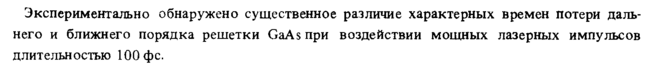 Экспериментально обнаружено существенное различие характерных времен потери дальнего и ближнего порядка решетки GaAs при воздействии мощных лазерных импульсов длительностью 100 фс.