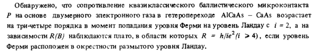 Обнаружено, что сопротивление квазиклассического баллистического микроконтакта Ρ на основе двумерного электронного газа в гетеропереходе AlCaAs CaAs возрастает на три-четыре порядка в момент попадания уровня Ферми на уровень Ландау с / = 2, а на зависимости R(В) наблюдаются плато, в области которых R = h/ie fi >4), если уровень Ферми расположен в окрестности размытого уровня Ландау,