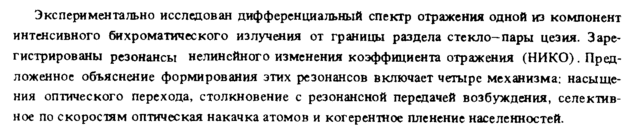 Экспериментально исследован дифференциальный спектр отражения одной из компонент интенсивного бихроматического излучения от границы раздела стекло-пары цезия. Зарегистрированы резонансы нелинейного изменения коэффициента отражения (НИКО). Предложенное объяснение формирования этих резонансов включает четыре механизма; насыщения оптического перехода, столкновение с резонансной передачей возбуждения, селективное по скоростям оптическая накачка атомов и когерентное пленение населенностей.