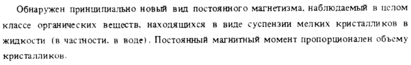 Обнаружен принципиально новый вид постоянного магнетизма, наблюдаемый в целом классе органических веществ, находящихся в виде суспензии мелких кристалликов в жидкости (в частности, в воде). Постоянный магнитный момент пропорционален объему кристалликов.