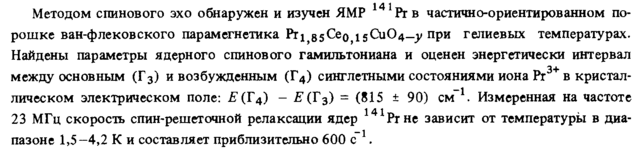 Методом спинового эхо обнаружен и изучен ЯМР Рг в частично-ориентированном порошке ван-флековского парамегнетика Prj 55^0,1 sCu^4—у ПРИ гелиевых температурах. Найдены параметры ядерного спинового гамильтониана и оценен энергетически интервал между основным (Г3) и возбужденным (Г4) синглетными состояниями иона Рг3+ в кристаллическом электрическом поле: £,(Г4) Е(Т3) = (815 ± 90) см"1. Измеренная на частоте 23 МГц скорость спин-решеточной релаксации ядер 41Ргне зависит от температуры в диапазоне 1,5-4,2 К и составляет приблизительно 600 с 1.