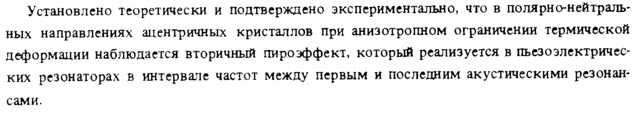 Установлено теоретически и подтверждено экспериментально, что в полярно-нейтральных направлениях ацентричных кристаллов при анизотропном ограничении термической деформации наблюдается вторичный пироэффект, который реализуется в пьезоэлектрических резонаторах в интервале частот между первым и последним акустическими резонан-сами.