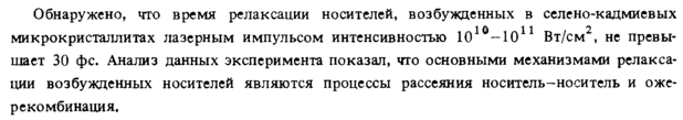 Обнаружено, что время релаксации носителей, возбужденных в селено-кадмиевых ми к ро кристаллитах лазерным импульсом интенсивностью 1010-10П Вт/см2, не превышает 30 фс. Анализ данных эксперимента показал, что основными механизмами релаксации возбужденных носителей являются процессы рассеяния носитель-носитель и оже-рекомбинация.