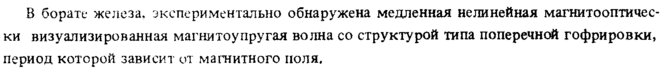 В борате железа, экспериментально обнаружена медленная нелинейная магнитооптически визуализированная магнитоупругая волна со структурой типа поперечной гофрировки, период которой зависит от магнитного поля.