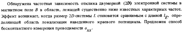 Обнаружена частотная зависимость отклика двумерной (2D) электронной системы в магнитном поле В в области, лежащей существенно ниже известных характерных частот. Эффект возникает, когда размер 2/>системы L становится сравнимым с длиной lg, определяющей область локализации наведенного краевого потенциала. Предложен способ бесконтактного измерения проводимости σ .