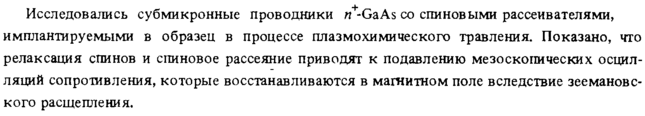Исследовались субмикронные проводники «+-GaAs со спиновыми рассеивателями, имплантируемыми в образец в процессе плазмохимического травления. Показано, что релаксация спинов и спиновое рассеяние приводят к подавлению мезоскопических осцил-ляций сопротивления, которые восстанавливаются в магнитном поле вследствие зеемановс-кого расщепления.