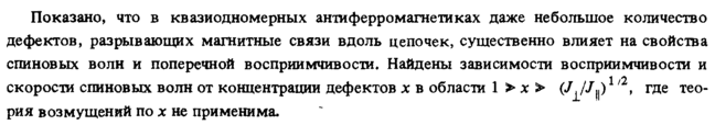 Показано, что в квазиодномерных антиферромагнетиках даже небольшое количество дефектов, разрывающих магнитные связи вдоль цепочек, существенно влияет на свойства спиновых волн и поперечной восприимчивости. Найдены зависимости восприимчивости и скорости спиновых волн от концентрации дефектов χ в области 1 > χ > (J^/J^)1/2f где теория возмущений по χ не применима.