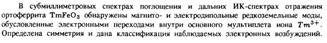В субмиллиметровых спектрах поглощения и дальних ИК-спектрах отражения ортоферрита TmFe03 обнаружены магнитои электродипольные редкоземельные моды, обусловленные электронными переходами внутри основного мультиллета иона Тт3+. Определена симметрия и дана классификация наблюдаемых электронных возбуждений.