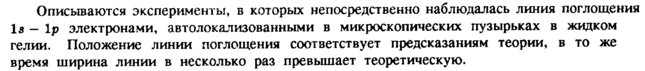 Описываются эксперименты, в которых непосредственно наблюдалась линия поглощения Is — 1р электронами, автолокализованными в микроскопических пузырьках в жидком гелии. Положение линии поглощения соответствует предсказаниям теории, в то же время ширина линии в несколько раз превышает теоретическую.