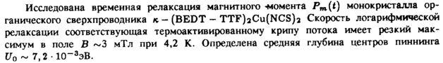 Исследована временная релаксация магнитного ^момента Pm(t) монокристалла органического сверхпроводника к (BEDT TTF)2Cu(NCS)2 Скорость логарифмической релаксации соответствующая термоактивированному крипу потока имеет резкий максимум в поле В ~3 мТл при 4,2 К. Определена средняя глубина центров пиннинга Uq ~ 7,2 10-3эВ.
