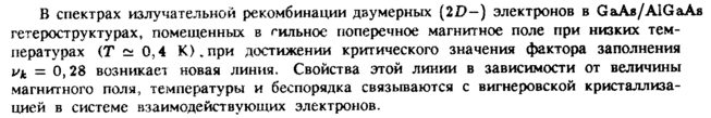 В спектрах излучательной рекомбинации двумерных {22}-) электронов в GaAs/AlGaAs гетероструктурах, помещенных в сильное поперечное магнитное поле при низких температурах (Τ ~ 0,4 К). при достижении критического значения фактора заполнения у* = 0,28 возникает новая линия. Свойства этой линии в зависимости от величины магнитного поля, температуры и беспорядка связываются с вигнеровской кристаллизацией в системе взаимодействующих электронов.