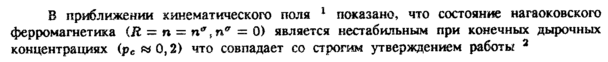 В приближении кинематического поля 1 показано, что состояние нагаоковского ферромагнетика (Л = η = η" f ησ = 0) является нестабильным при конечных дырочных концентрациях (рс ^0,2) что совпадает со строгим утверждением работы 2